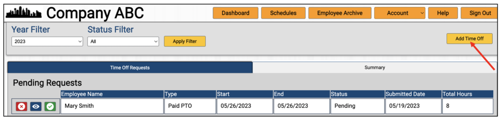 An employer or manager can also add a time off on behalf of employees by clicking the Add Time Off button