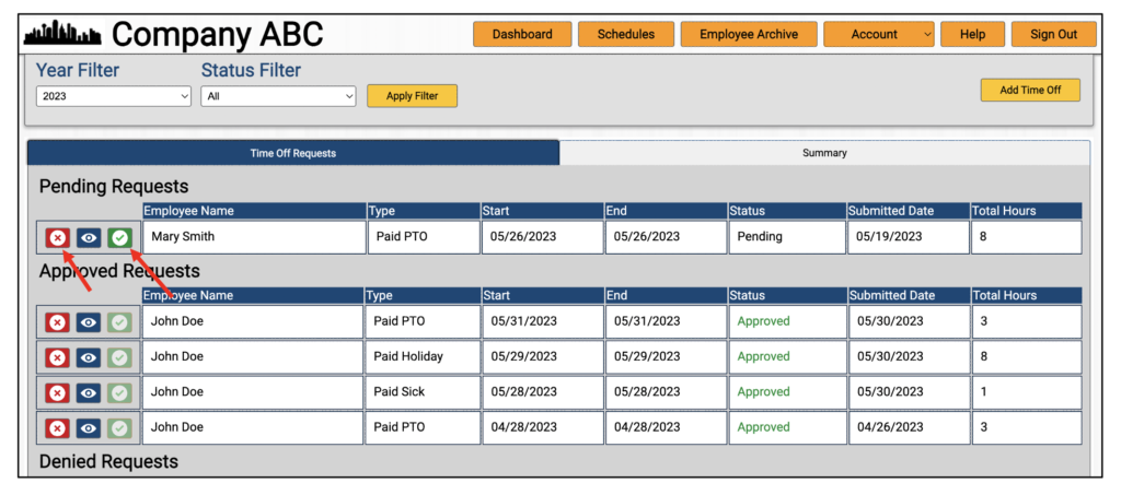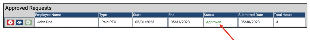 The employer or manager can then approve or deny the request by clicking the approve/deny icons: