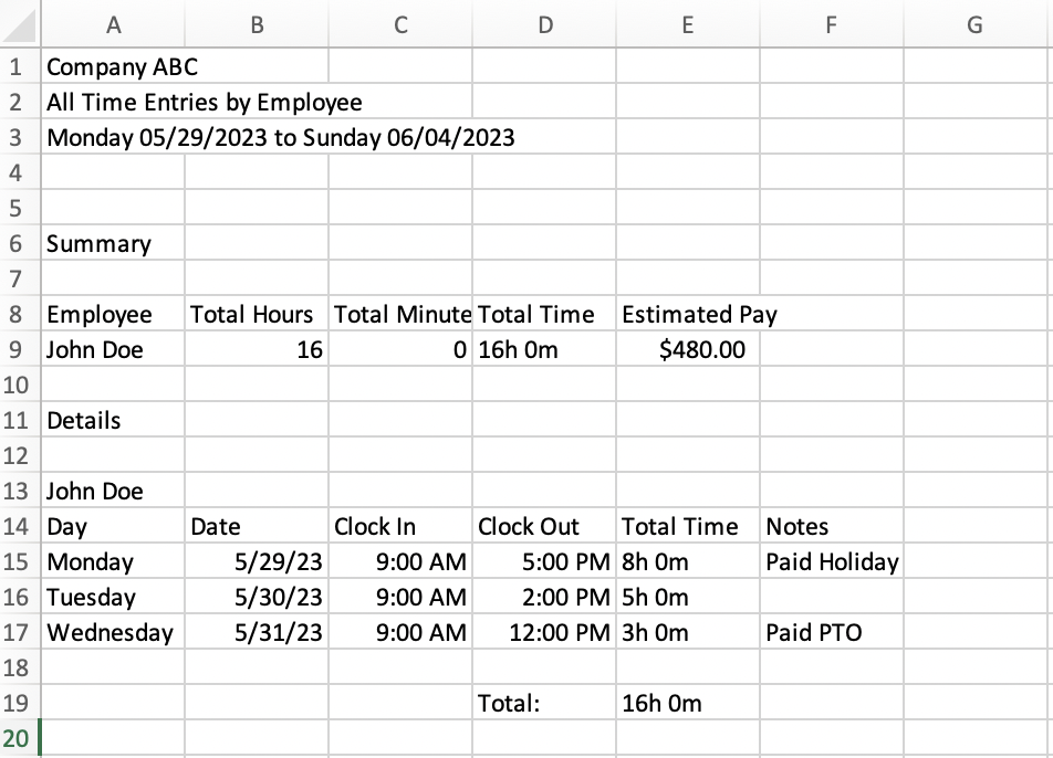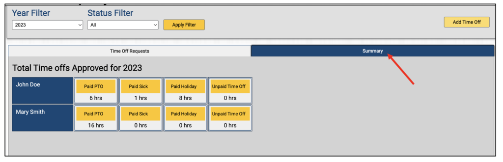 To view how many time off hours an employee has taken click the Summary tab. Here you will see each employee and how many hours they took for Paid PTO and other time off types.
