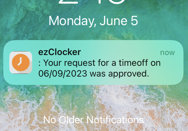 The employer will get a notification on their phone if they have the ezClocker app installed. The notification will look like this