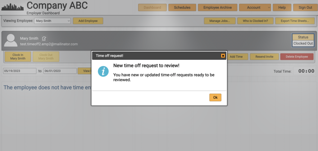 And if they sign into the ezClocker website they will see the following message indicating there are time off requests they need to review: