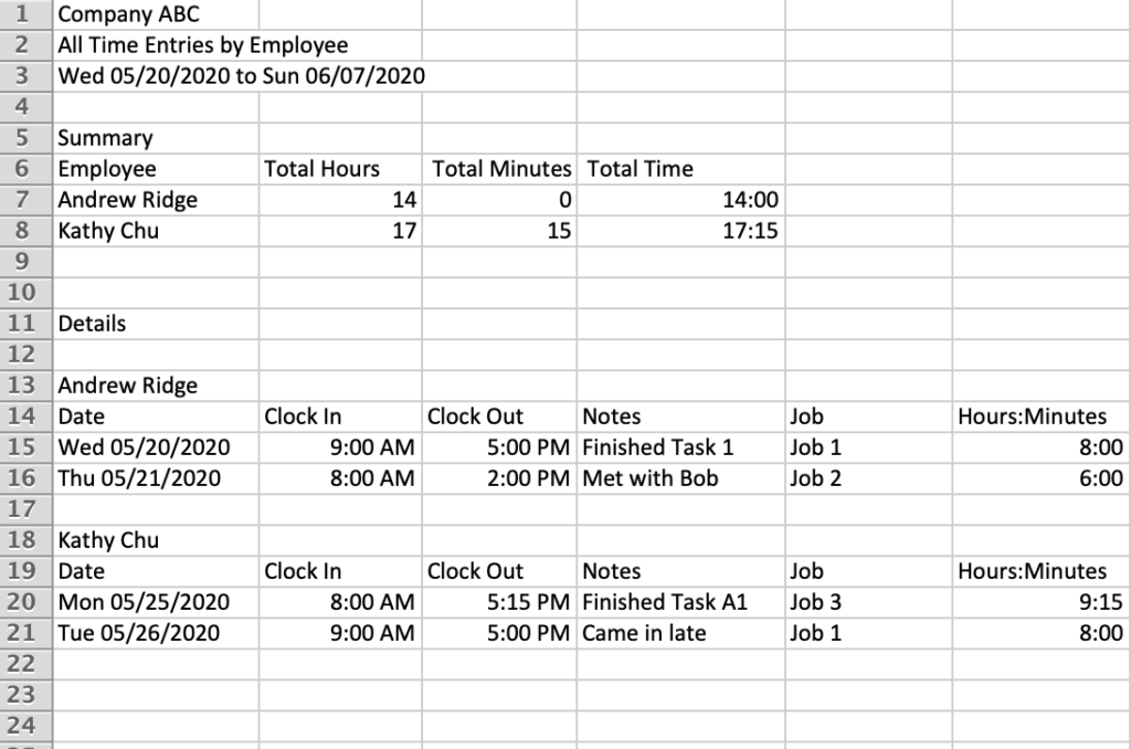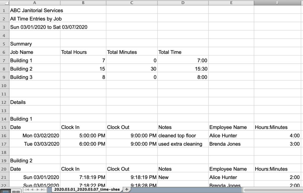 When you export Jobs you will get a .csv file similar to the one you get from All employees but here it will group the timesheets by job name