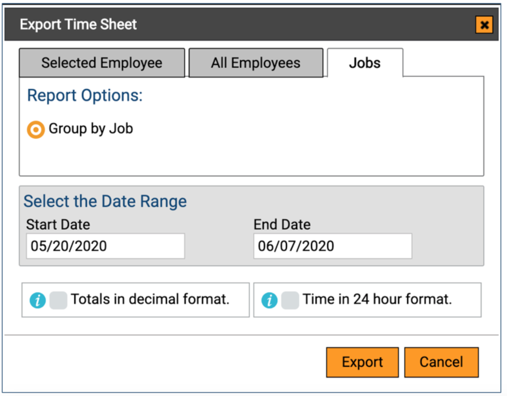 One of the challenges of running a business is to figure out how much each job costs you in labor and this is where exporting timesheets with jobs comes in handy. When you click the Export timesheets button on the website’s dashboard you’ll see a new tab called Jobs
