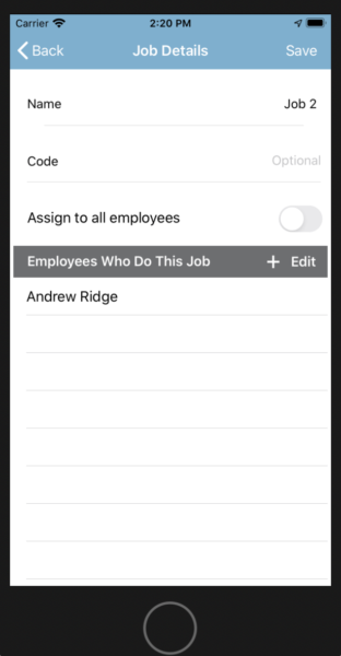 In the job details screen you can add a name for the job, code (optional) and just like the website you can assign the job to all employees or specific employees.