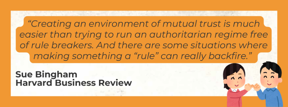 Sue Bingham, a writer for Harvard Business Review states, “Creating an environment of mutual trust is much easier than trying to run an authoritarian regime free of rule breakers. And there are some situations where making something a “rule” can really backfire.”