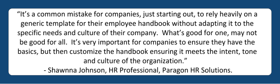 Your employee handbook should fit your culture and values and be tailored to your specific needs.