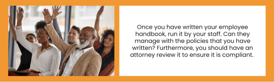 Great workers like clear policies and direction. When hiring new staff, discuss your culture, values, and mission. Review the benefits of working there too. Your handbook can be a great sales tool for you when hiring.
